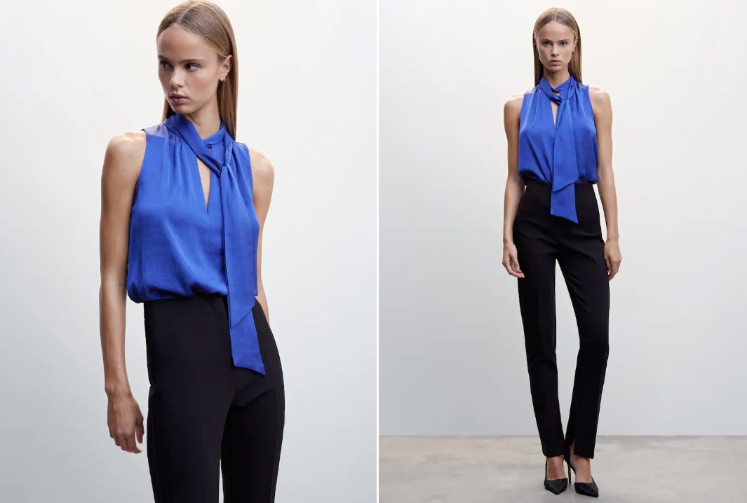 Otra de las blusas que no querrás dejar pasar es esta. Con acabado satinado y disponible en un bonito y llamativo tono azul, es otra de las prendas de Mango que más te llamarán la atención para las fiestas debido a su sencillez, pero también por su elegancia. Con detalle de lazo en el cuello, la puedes conseguir por solo 25,99 euros.