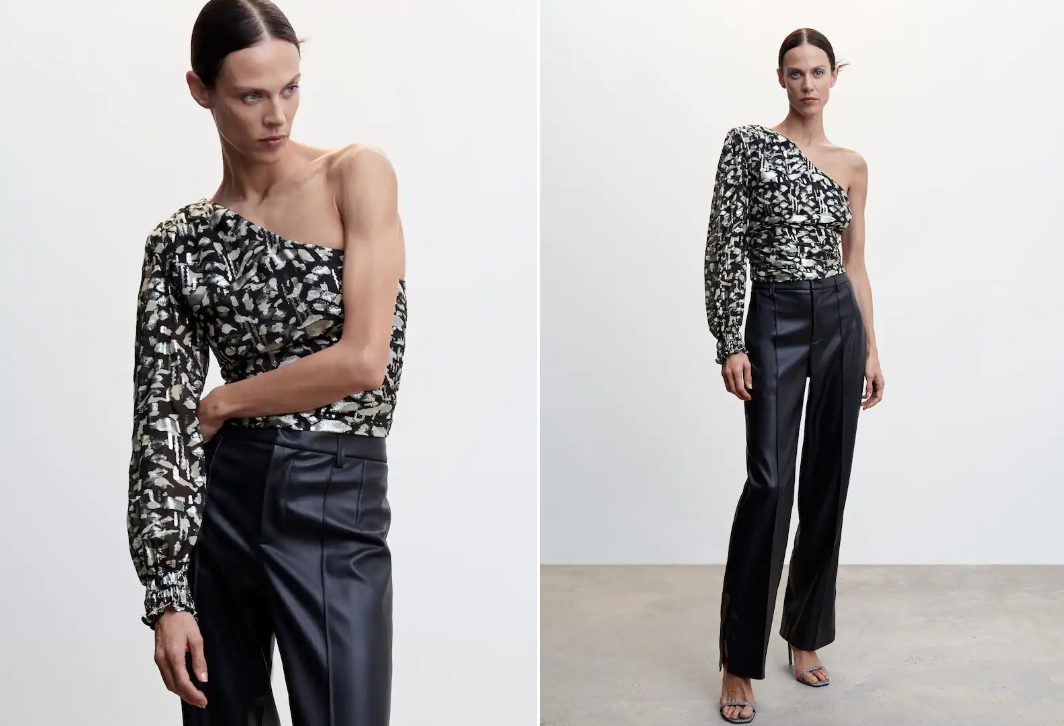 Esta blusa es una de las prendas de Mango que no pueden faltar en tu armario si lo que buscas es destacar en Nochevieja sin necesidad de invertir demasiado dinero. De corte asimétrico y con detalle de brillos, también llama la atención por el bonito contraste que crean sus tonos blanco y negro. Además, es muy económica, pues está disponible por solo 29,99 euros.