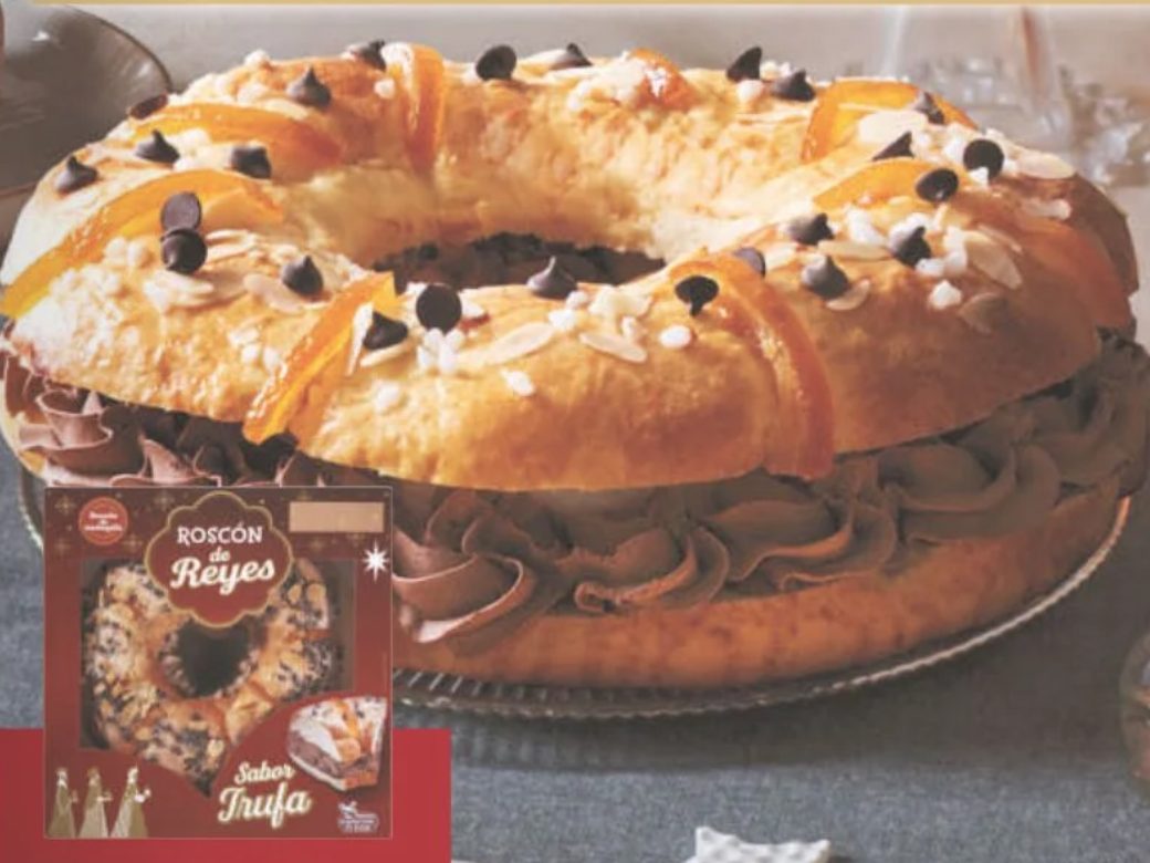 Si te apetece probar una nueva variedad del tradicional Roscón de Reyes una gran opción es el de sabor trufa de Lidl. La masa es tan esponjosa como los demás añadiendo un relleno de trufa. Además su decoración es diferente ya que lleva el azúcar, las almendras, pieles de naranja confitadas y gotas de chocolate. Su precio es muy asequible ya que por solo 5,49 € puedes conseguir una unidad de 750 gramos para disfrutar del Día de Reyes.