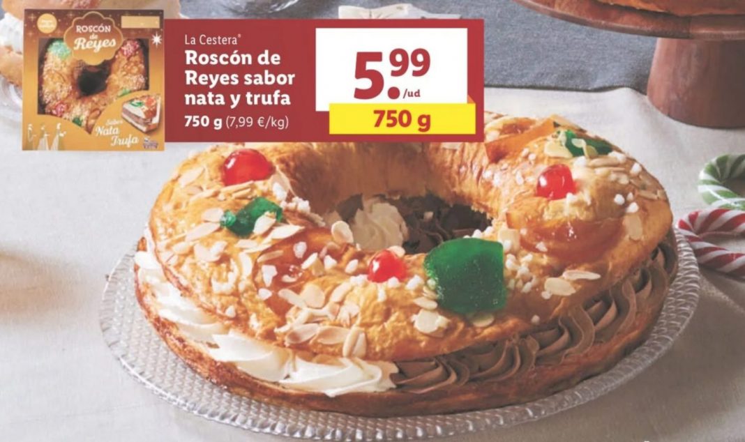 Para los más golosos Lidl mezcla sus roscones con nata y con trufa dando lugar a uno con los dos tipos de relleno. Es perfecto para el Día de Reyes ya que con una sola unidad conquistarás todos los paladares. Se elabora como el roscón sin relleno decorándolo por encima con azúcar, almendras, lindas, naranjas confitadas y calabazate. Por solo 5,99 € te llevarás un Roscón de Reyes sabor nata y trufa de 750 gramos de La Cestera.