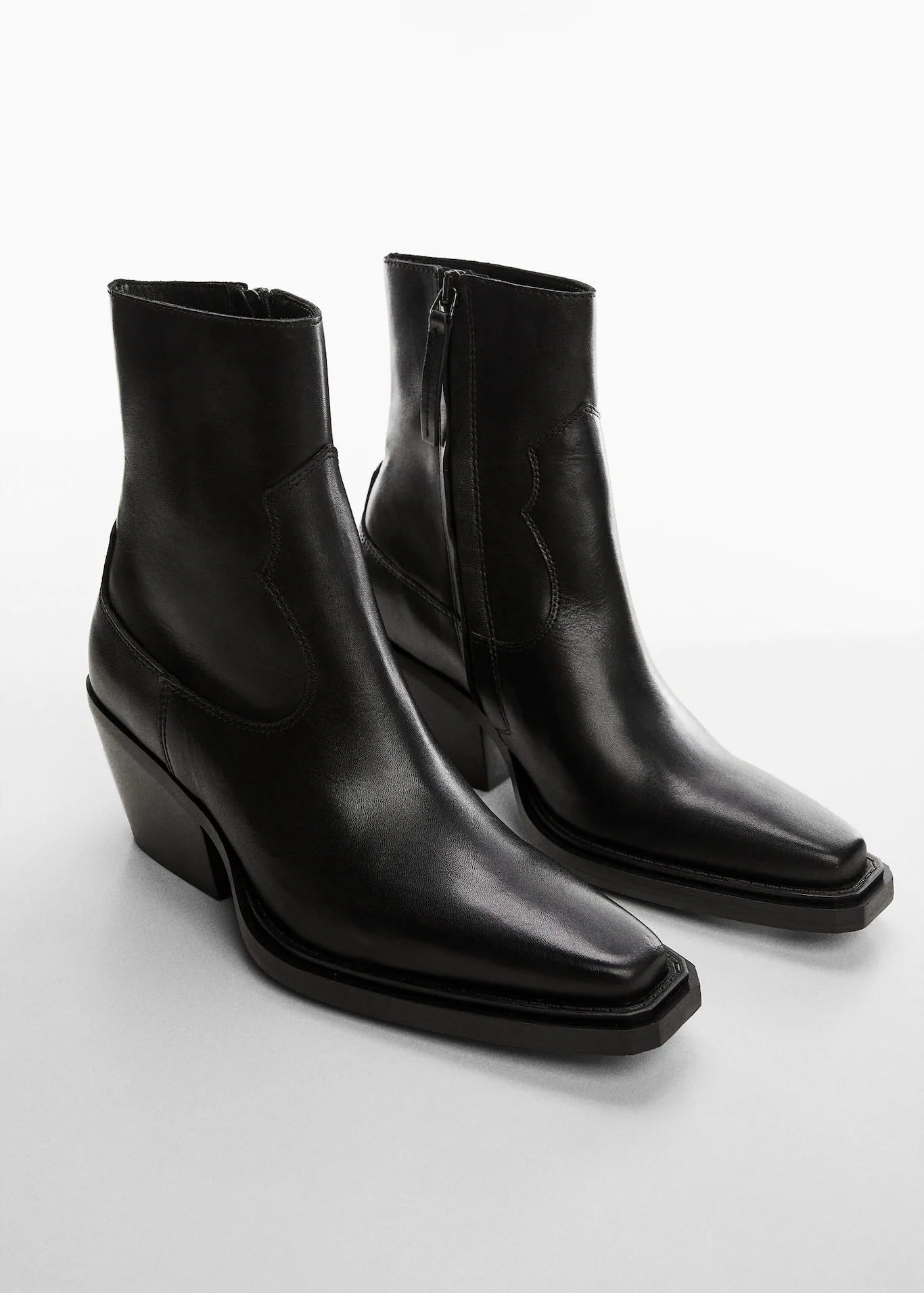 Una alternativa a la opción anterior son estos botines de piel estilo cowboy con punta cuadrada y tacón bajo. La gran diferencia entre ambos es que estos que te mostramos ahora son mucho más cómodos pero no pierden el toque elegante y original de los primeros. Están fabricados con un tejido 100% piel bovino lo que garantiza su calidad y durabilidad. Su precio es de 89,99 euros y, por el momento, solo están disponibles en negro.