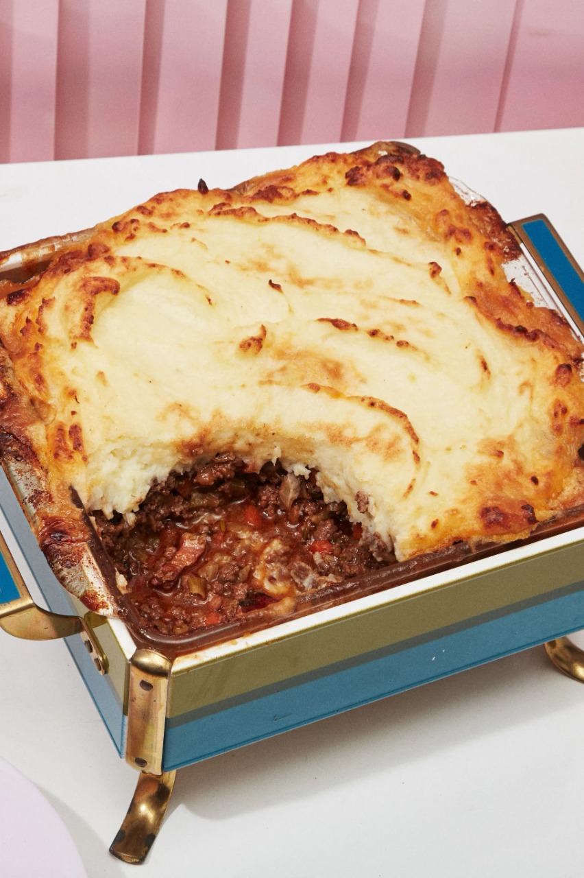 Quitamos la piel de las patatas y del ajo. Machamos, agregamos mantequilla y sazonamos. Cogemos una fuente de horno y la cubrimos con salsa de tomate poniendo una capa de carne cubriendo una capa de patata. Echamos polvos de queso encima y dejamos que se gratine en el horno con el resto de los ingredientes. Cuando veamos que está dorado, ahí está preparado. Puede utilizarse para la receta carne de vacuno o de cerdo. Elegir una opción u otra dependerá de las preferencias de los comensales o el propio cocinero o cocinera. En los días que hay más prisa, las patatas pueden cortarse en trozos más pequeños para que se cuezan antes. La pega de esto es que se pierde en el caldo algún mineral.
