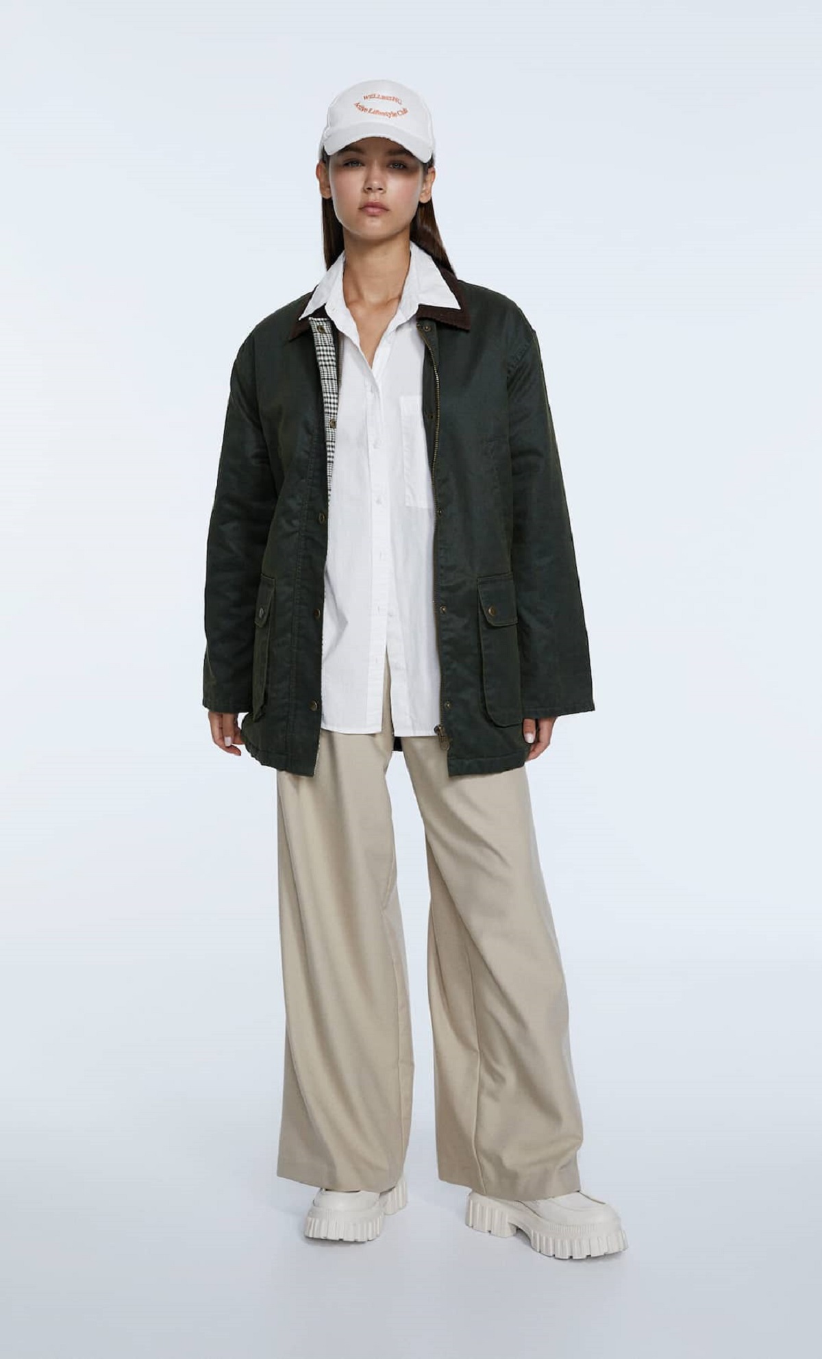 Ya ha empezado el invierno y necesitamos sí o sí un abrigo para cobijarnos de las bajas temperaturas. Hay momentos en los que no queremos piezas demasiado abrigadas, sino algo que nos sirva para no sentir frío, pero con libertad de movimiento. Deléitate con esta parka efecto encerado con cuello solapa de pana posee forro acolchado, bolsillos plastrón delanteros con botones a presión, manga larga con detalle de puño de cuadros con vuelta, cierre frontal con cremallera metálica y una solapa forro cuadro de botones a presión. Por si esto fuera poco, en la espalda tiene un detalle de abertura. Su precio es 69,99 euros. ¡No encontrarás otro igual!