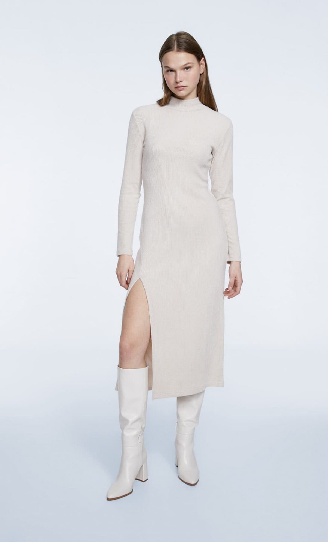 Este vestido midi de Stradivarius es un sueño hecho realidad. Con una abertura en el lado permite otorgar un toque de sensualidad a un ‘look’ invernal total. Cuenta con un tejido suave que se siente a la primera caricia y se encuentra disponible en varios colores. ¿Trabajas en una oficina y quieres ir elegante a la vez que abrigada? No hace falta que sigas buscando porque has dado con el diseño ideal. Vale 19,99 euros. ¡Una locura!