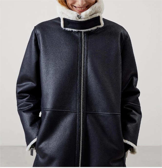 La elegancia por bandera con este chaquetón en textura piel con cuello alto con cierre y mangas con cremallera. Un modelo de Adolfo Domínguez casi a mitad de precio y que es perfecto para el día a día: irás abrigada a la par que elegante.
