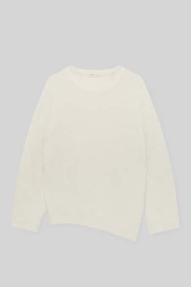 El jersey es la prenda del invierno por excelencia. Si buscas un modelo básico que te combine con todo, pero que tenga algo que lo haga especial, este diseño de Pull & Bear es perfecto. Tiene el cuello redondeo, manga larga y es de corte largo, suelto y ligeramente oversize. Destaca la forma del bajo que en vez de ser recto tiene un acabado asimétrico. El jersey es de un tejido suave y muy agradable al tacto y se puede elegir entre color negro y crudo. Llévatelo a casa por solo 9,99€.