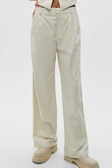 Este pantalón de vestir combina un diseño formal con un espíritu moderno y juvenil. Tiene doble pinza, una cintura con trabillas para combinar con cinturón y cierre de botón y cremallera. La pierna es recta y ligeramente suelta, y lleva dos bolsillos laterales. Es de liocel y algodón en color blanco hielo. El precio en Pull & Bear es de 9,99 € y puedes llevarte un chaleco a juego para conseguir un total look.
