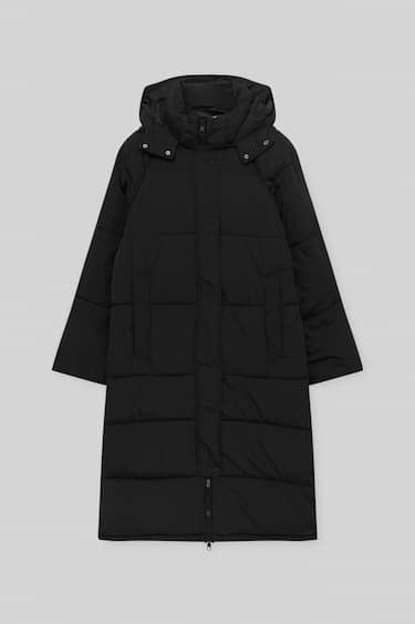 Los abrigos acolchados son una gran solución para combatir el frío. En Pull & Bear podemos conseguir este modelo de corte largo y con una amplia capucha. Tiene cierre con cremallera que queda oculta, dos bolsillos laterales a la altura perfecta para abrigar las manos y una abertura en el bajo para una mayor comodidad de movimientos. Está fabricado con un relleno de poliéster 100% reciclado. El exterior es de nailon resistente al agua, de color negro. Puedes llevártelo por un precio de 19,99€.