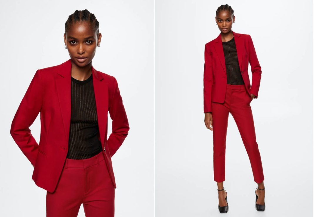 Los trajes están de moda no, lo siguiente. A todas se nos cae la baba por los trajes, especialmente los de colores como los rojos o fucsias. Estas opciones están muy bonitas la primera vez que te las pones, pero a la segunda es fácil darse cuenta de que llevas lo mismo. Para lucirte en la oficina no sirve mucho, porque, cada vez que lo reutilices, todos dirán ahí está el pantalón rojo de. Mango tiene diseños más bonitos y económicos. Este valía 25,99 euros. Ahora tiene aplicada una rebaja del 38%.