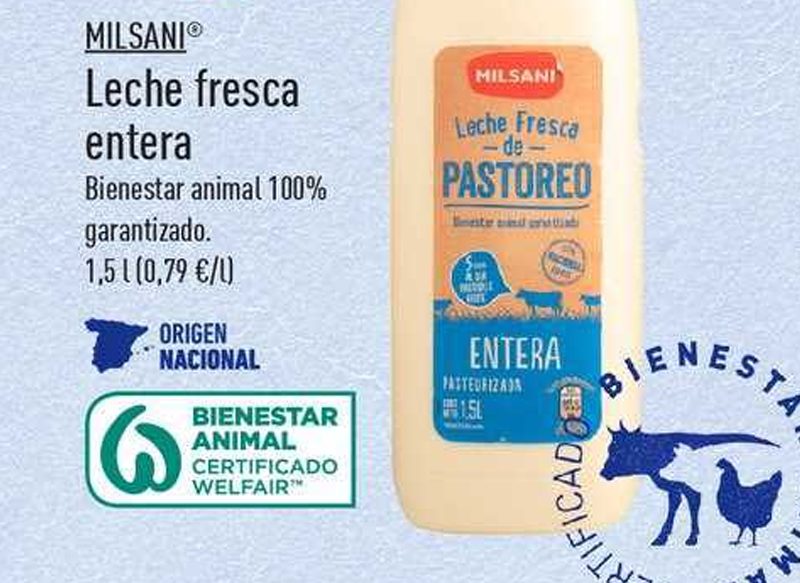 A la venta por solo 1,18 euros, la leche fresca de pastoreo Milsani es uno de los productos más destacados, estando elaborada con vacas que se alimentan principalmente de pastos naturales. Es un producto de origen nacional y se elabora bajo procesos de bienestar animal (100% garantizado).