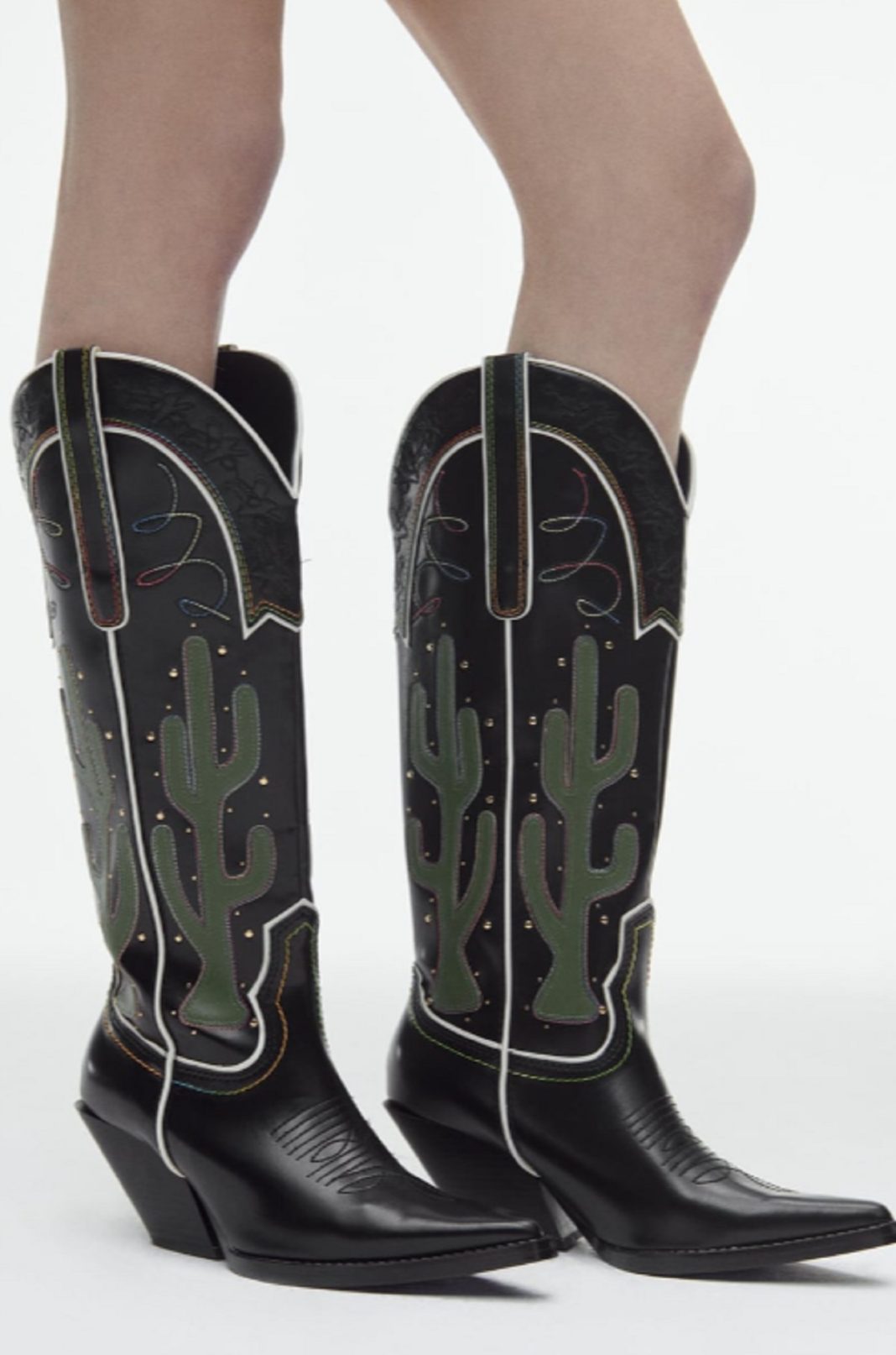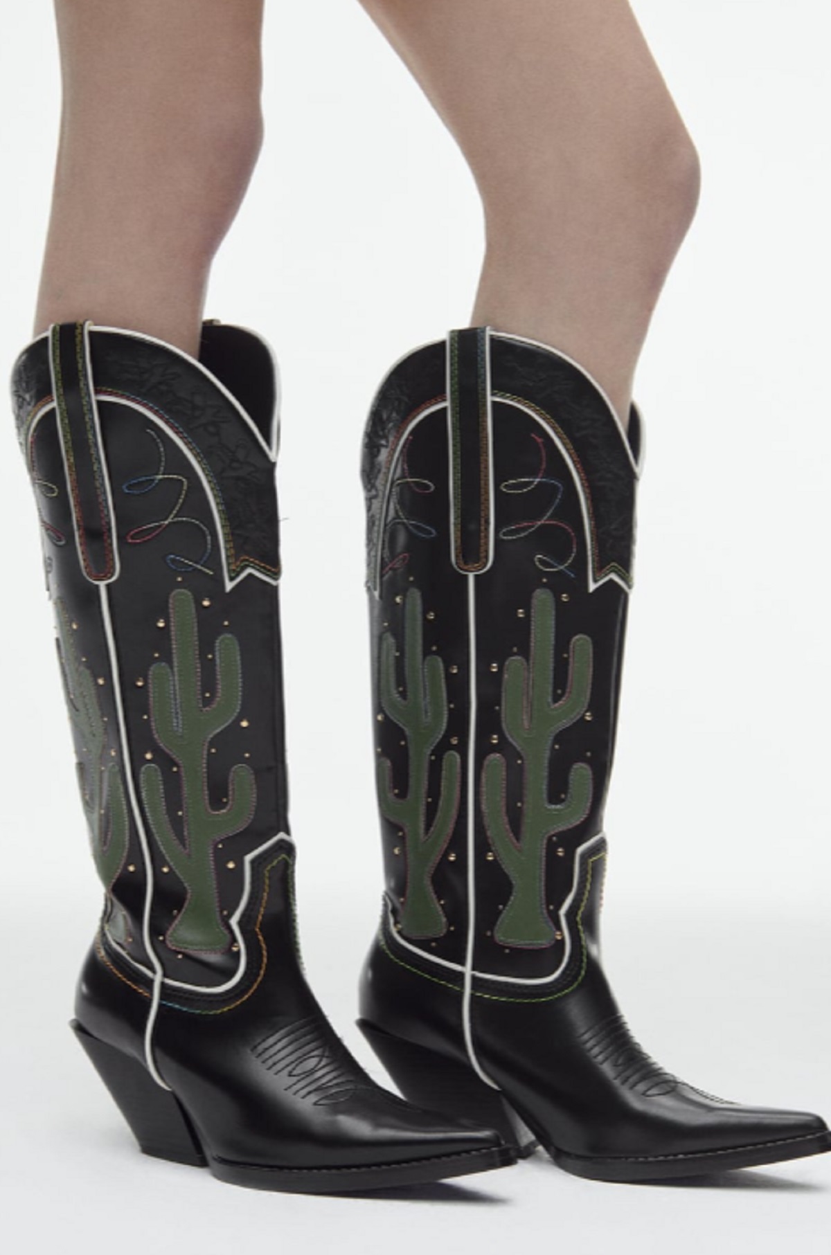 Negar que son ideales es negar lo más evidente. Este zapato tipo bota alta estilo cowboy con dibujo de cactus y bordados te hará sentir como si estuvieras en el lejano oeste. Cuenta con una puntera, borde de la caña en contraste, tiradores en los laterales y acabado en punta. Para llevar con vestido o pantalón, el impacto será el mismo. ¿Quieres algo original que no muchas se animarían a llevar? ¡Has dado con el zapato perfecto! Su precio es 79,95 euros.