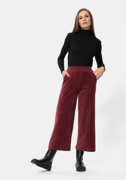 Empezamos con el pantalón largo de pana de mujer. Es un pantalón largo de estilo culotte, que viene con un detalle elástico en la cintura. Su final es de tipo campana, alargándose en la parte de los tobillos para que quede totalmente amplio.