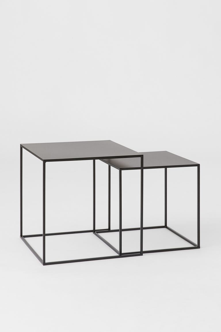 Los juegos de mesas nido ofrecen un montón de posibilidades, ya que son tan funcionales como decorativas. Se trata de mesas gemelas pero en tamaños diferentes, que se pueden usar juntas o por separado. Si se necesita ahorrar espacio, la mesa pequeña se puede guardar debajo de la más grande. Las de H&M son de metal pintado con un elegante acabado en negro. Tiene unas medidas de 43x43x43 cm y 50x50x50 cm y las dos juntas tienen un precio de 169 euros.
