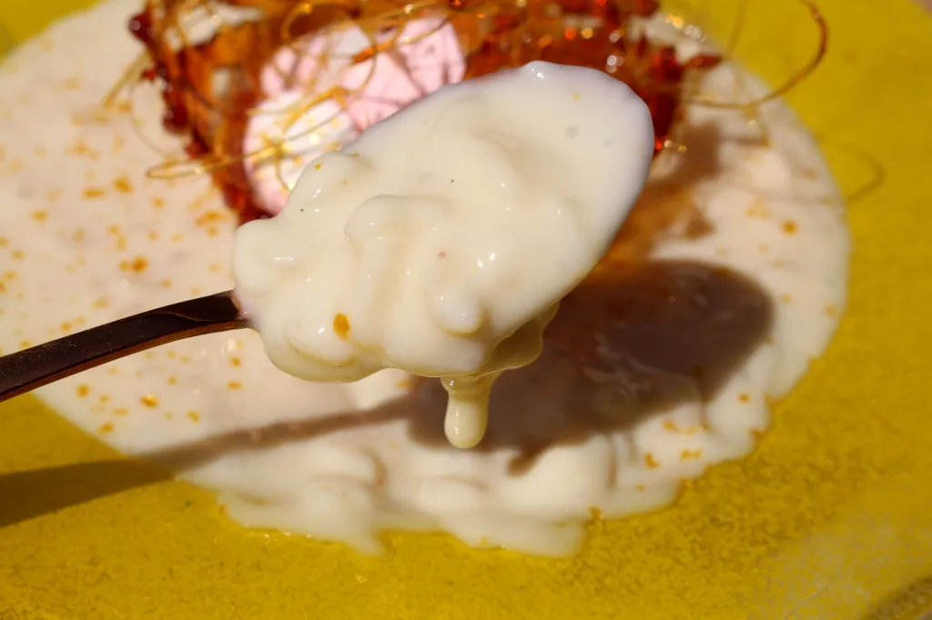 Seguidamente, ponemos el arroz en una cazuela baja y lo cubrimos con un poco de la leche infusionada. No hay que verter toda la leche, solo lo justo para que abra el arroz y un poco más. Llevamos a ebullición y dejamos que cueza a fuego vivo hasta que el líquido quede reducido a 1/4 de lo inicial. Después vamos añadiendo poco a poco más leche, dejamos reducir, y agregamos más leche hasta terminarla toda. Hay que dejar que reduzca el líquido a 1/4 también al final.