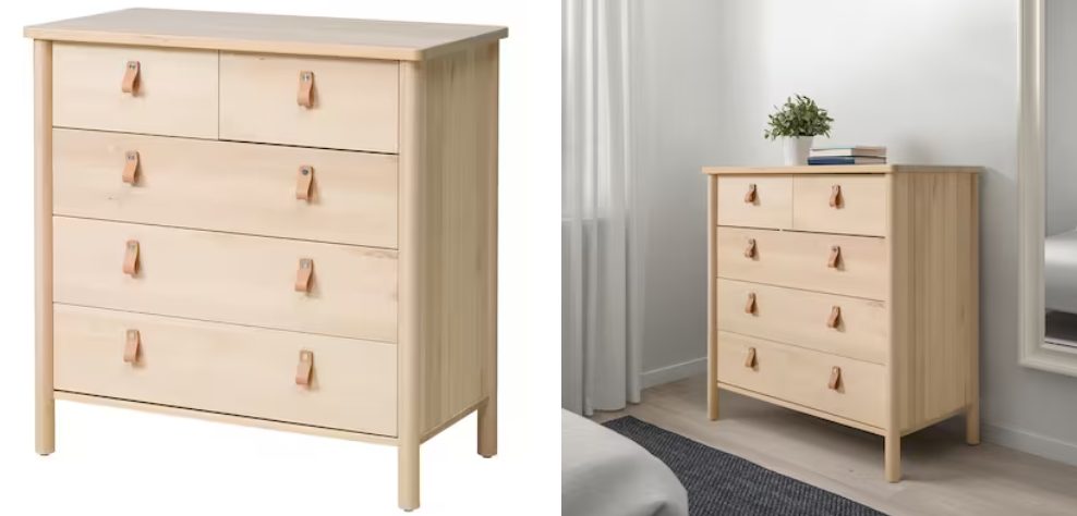 Con cinco cajones, tres de mayor tamaño y dos más pequeños, esta cómoda de abedul de Ikea se ha convertido en una de las más buscadas. De tono natural, uno de los detalles por los que más llama la atención es por sus tiradores, en forma de correa. Sobre su precio, la tienes disponible por 299 euros. Será una buena inversión.