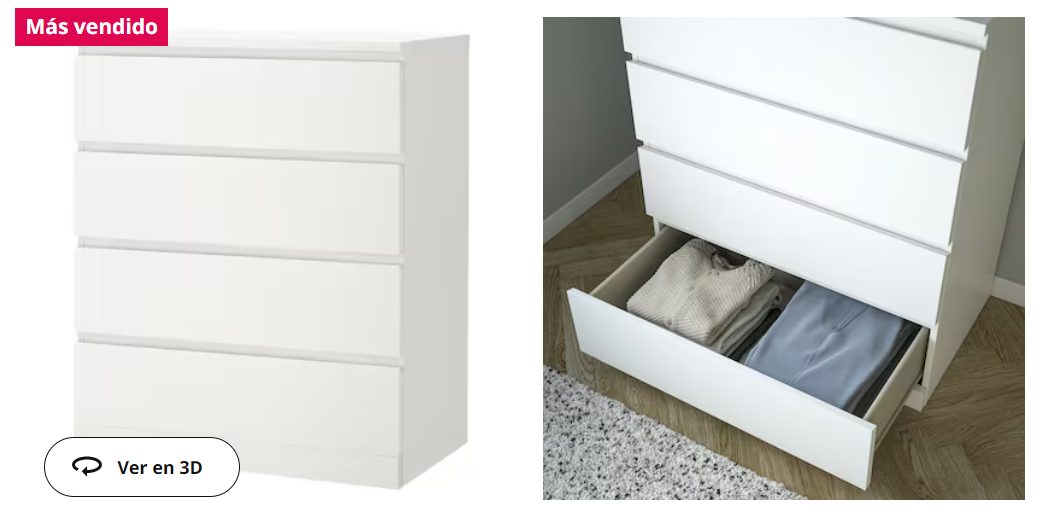 Si buscas algo más pequeño, ideal para espacios de menor tamaño, otro de los armarios multiusos de Ikea que no te puedes perder es este. Se trata de una cómoda vertical, con cuatro amplios cajones, que también está disponible en color blanco para combinar con todo. Además, te la puedes llevar a casa por tan solo 109 euros.