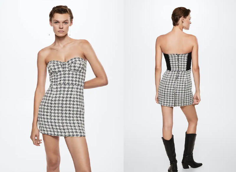 Es un vestido de tejido mezcla de algodón y tejido tweed con estampado pata de gallo y un diseño corto y entallado, de estilo corsetero. Tiene tirantes desmontables y paneles elásticos en contraste, así como forro interior y cremallera metálico en la parte posterior.