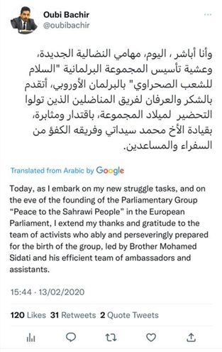 El representante del Polisario en Bruselas habría expresado su alegría y orgullo por la creación de este Intergrupo en un tuit en árabe de 2020. Este tweet prueba que el Intergrupo obedece a la agenda política de Argelia y el Polisario. Y en consecuencia demuestra la injerencia de un tercer país en los asuntos del Parlamento Europeo.