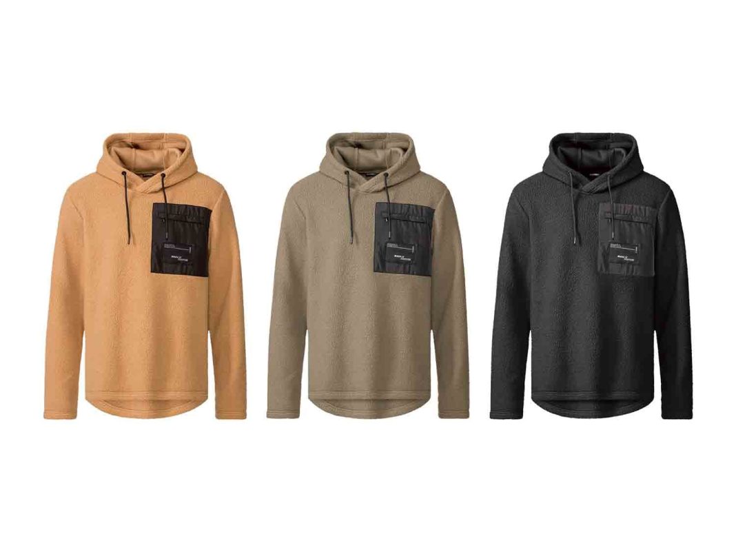 Este jersey con capucha para hombre está hecho con un agradable tejido polar muy suave, mullido y envolvente. Tiene un corte ancho con la parte de atrás ligeramente más larga. La capucha tiene una cinta ajustable y lleva un bolsillo de material a contraste en el pecho, con cierre de cremallera. También tiene un parche decorativo en el pecho que le da un toque original y casual. Está disponible en tallas de la S a la XL y en colores oliva, beige y negro. El precio es de 14,99 euros.