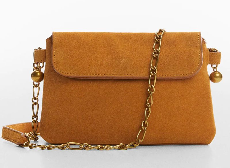 En Mango podemos encontrar una amplia cantidad de modelos de bolsos entre los que elegir, lo que hace que haya propuestas para todos los gustos y necesidades. Una de sus novedades es este bolso serraje cadena, disponible tanto en acabado de color mostaza como en marrón por un precio de 39,99 euros.