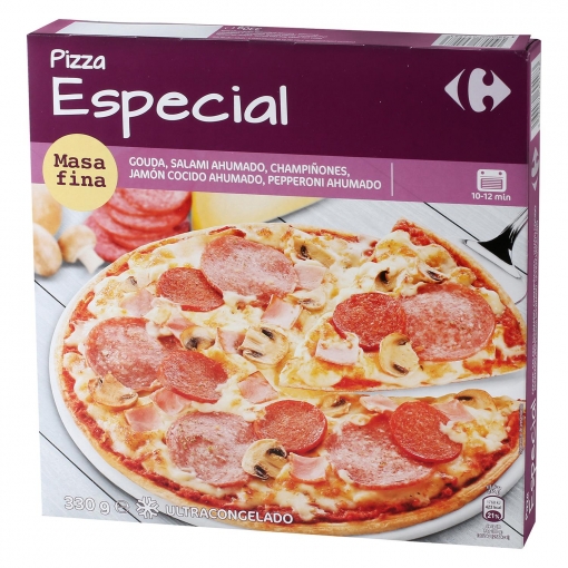 Dentro de la selección de pizzas congeladas de Carrefour, también podrás encontrar varias opciones de la misma marca del supermercado. En este caso, una de las que más destacan es la pizza Especial, con champión, pepperoni, jamón y queso. Perfecta para darte un buen festín, además la tienes disponible por 2,39 euros.