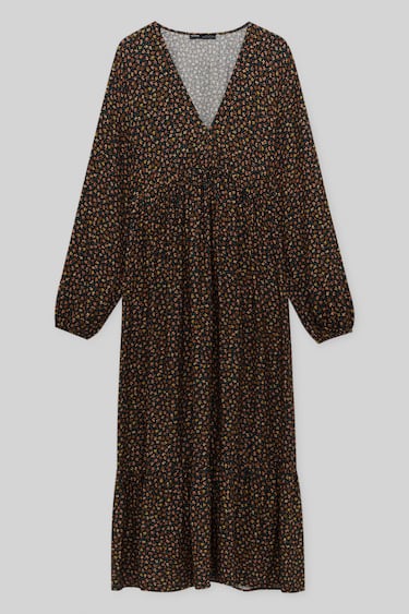 Si tu rollo es más bien rústico y bohemio, este vestido de Pull & Bear es un firme candidato a colarse en tu armario. Es de largo midi y manga larga, con una silueta fluida, muy cómodo, informar y relajado, con cuello de pico y gomas en los puños. Hay dos modelos diferentes, ambos con estampados multicolores, con un espíritu muy primaveral. Es de 100% viscosa y puedes llevártelo por 20,99 euros.