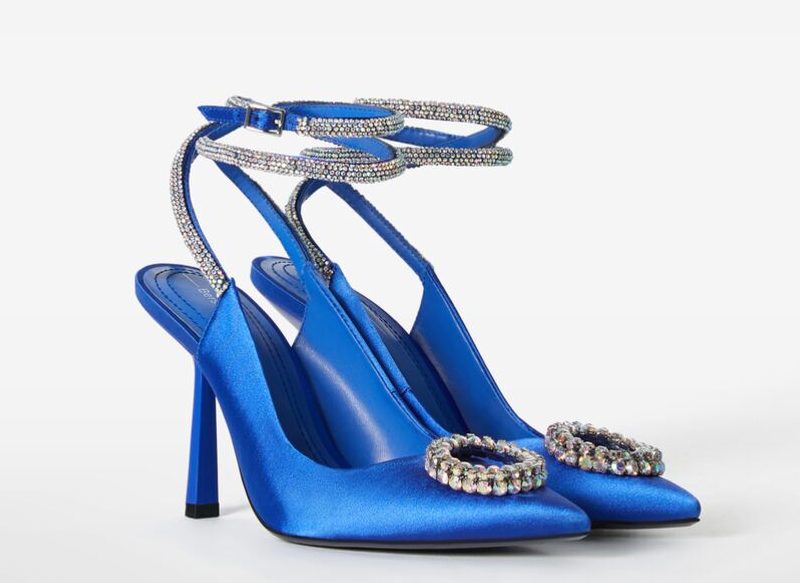 Disponibles en color azul y en verde, es un zapato de tacón destalonado tipo raso con detalle de adornos con brillos y cierre mediante pulsera con hebilla. Tiene punta fina y un tacón de 10 cm de altura, además de una plantilla técnica flexible compuesta de látex que ofrece el mayor confort.