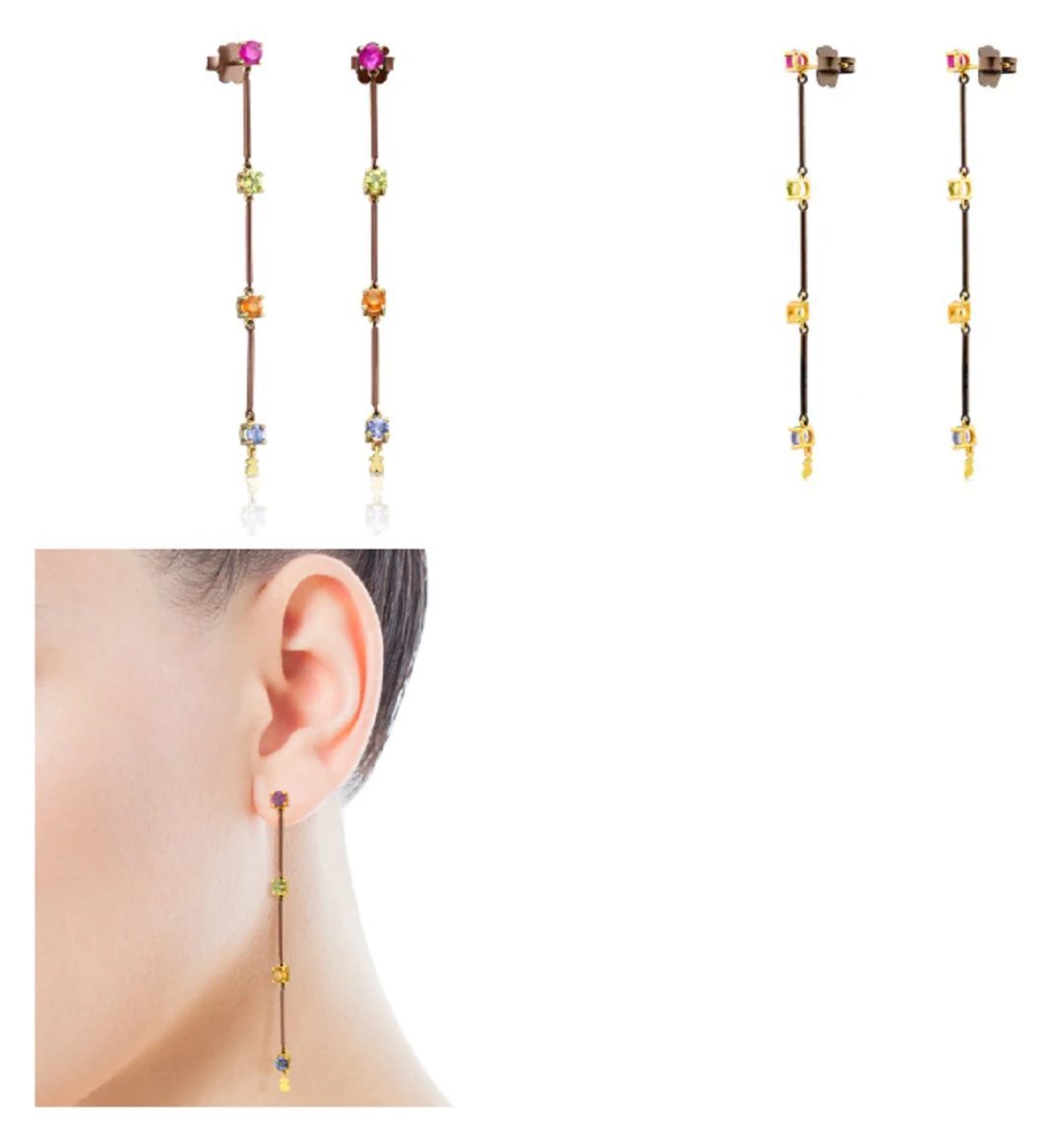 ¿Pensabas que solo íbamos a incluir unos pendientes largos? Este otro modelo nos dejó sin palabras desde el primer momento en que lo vimos. Posee pendientes de titanio de oro amarrillo de 18kt y titanio con rubí, tazanita, granate y peridoto. Su precio actual es 398 euros, el anterior 595. Recuerda que todas las joyas y complementos de Tous tienen una garantía legal de 3 años.