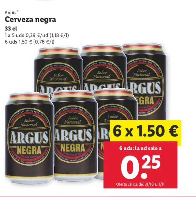 Esta bebida alcohólica es una de las mejor valoradas por la OCU de todas las que se pueden encontrar en el supermercado Lidl. Se presenta en latas de 33 cl y, la que recomienda el organismo, es la cerveza negra de la marca ARGUS. Con un sabor fuerte y algo amargo, cuenta con 5,6º de alcohol y, entre sus ingredientes, destacan la cebada, el maíz, la malta de cebada y el agua, así como estabilizantes, colorantes y aromas. Sobre su precio, cuesta alrededor de 1,50 euros el pack de 6.