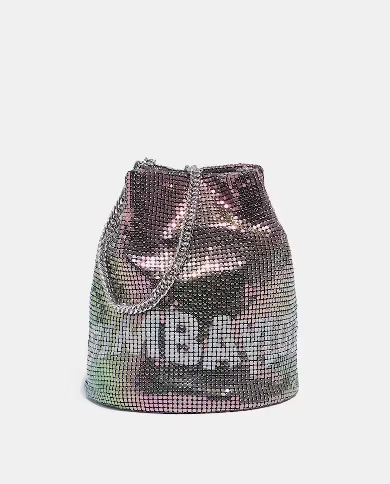 Divino bolso plano de forma de saco ideal para acompañarte en tus salidas de fin de semana y otras fiestas. Es de malla plateada en un bonito color verde. Este bolso está fabricado en poliéster y aluminio con cadena para colgar el bolso en el hombro
