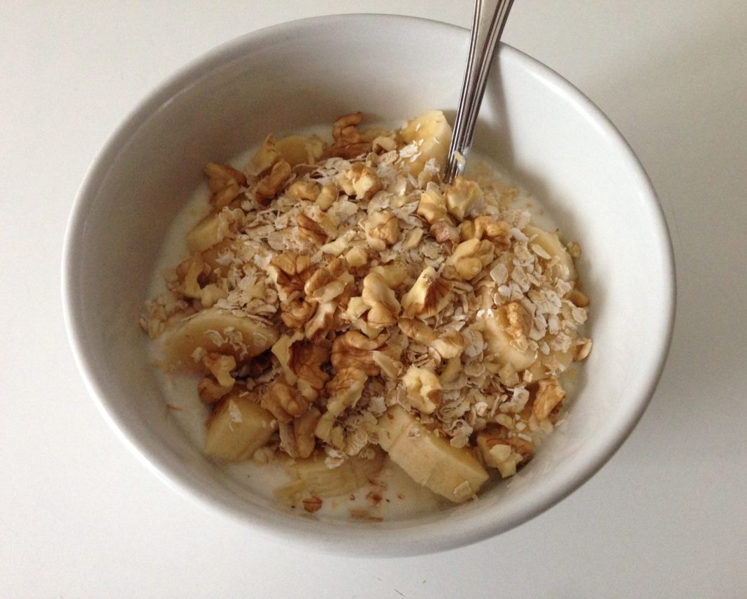 Todos tenemos ese amigo o amiga al que le gusta cuidar y tiene avena en casa. Si tienes modo de tomar pan, un yogur natural con avena puede ser justo lo que necesitas. Proporciona fibra, sacia y otorga de proteínas y calcio al cuerpo. El yogur aporta bacterias beneficiosas para el intestino y repone la flora intestinal. La avena brinda inulina y fibra. Una explosión de beneficios para tu cuerpo y, además, ¡está de muerte!