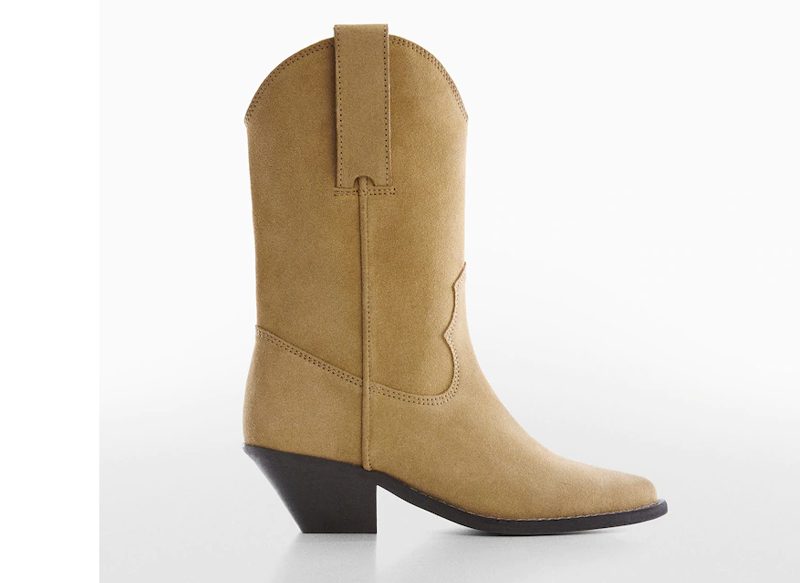 Entre los modelos destacados de la firma española también hay que destacar una de las últimas novedades en calzado de Mango, como es este botín piel estilo cowboy, disponible en color arena y con un precio de venta de 99,99 euros.