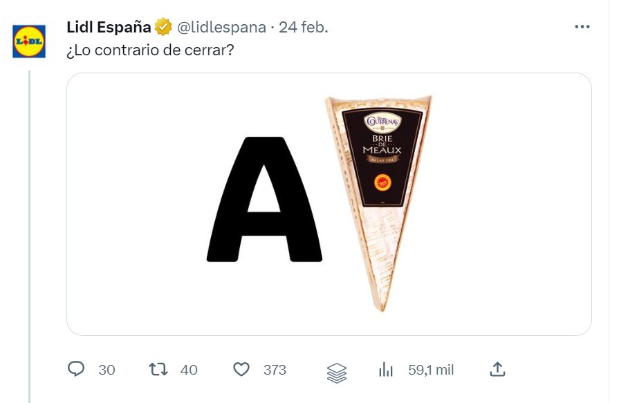 Ahora que ya sabes un poco más sobre Lidl y sus productos más destacados, en los últimos días ha llamado la atención un tuit que publicó el CM de la marca en Twitter. Intentando, una vez más, destacar sus quesos como uno de sus artículos estrella, pudimos ver cómo desde la marca publicaban un «meme» donde preguntaban qué es lo contrario de cerrar. En la imagen, aparecía una A y una fotografía del queso brie más aplaudido: el Brie de Meaux.