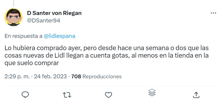 Desde Lidl pretendían hacer una gracia simpática a través de Twitter, estrategia de marketing que llevan a cabo todos los grandes establecimientos. Sin embargo, la respuesta de un cliente no fue tan graciosa. El usuario de la red social @Dsanter94 les hacía el siguiente comentario: «Lo hubiera comprado ayer, pero desde hace una semana o dos que las cosas nuevas de Lidl llegan a cuenta gotas, al menos en la tienda en la que suelo comprar».