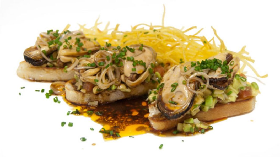 Los componentes para la mezcla de los mejillones son 3 latas de mejillones, 1 lima, 4 piparras en escabeche, 2 ajos, vinagre de arroz, comino, pimentón, sal y pimienta. Empezamos utilizando el pico de gallo (vinagreta). Con la ayuda de un cuchillo, hacemos una cruz en la parte de atrás del tomate, escaldamos lo tomates en agua hirviendo entre 30 y 35 segundos. Después cortamos la cocción poniéndolos en agua con hielo. Los pelamos, cortamos en 4, quitamos la pulpa y las semillas.