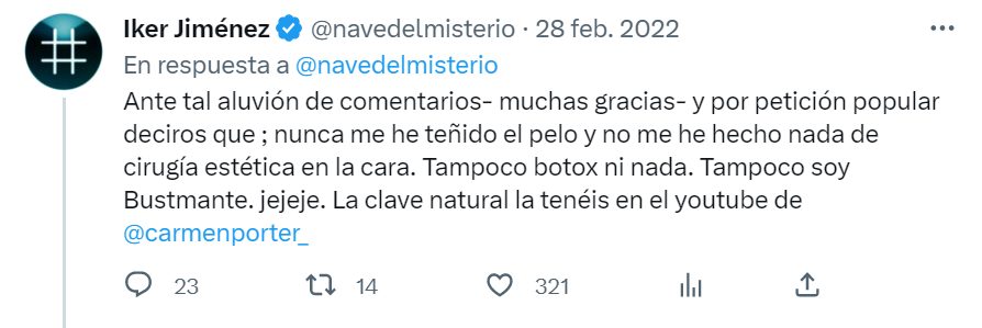 La reacción en redes no se hizo esperar, cosa que no tardó en llamar la atención del presentador. Ante la buena acogida de la publicación, Iker Jiménez indicó que: «Ante tal aluvión de comentarios -muchas gracias- y por petición popular deciros que nunca me he teñido el pelo y no me he hecho nada de cirugía estética en la cara. Tampoco bótox ni nada. Tampoco soy Bustamante, jejeje».