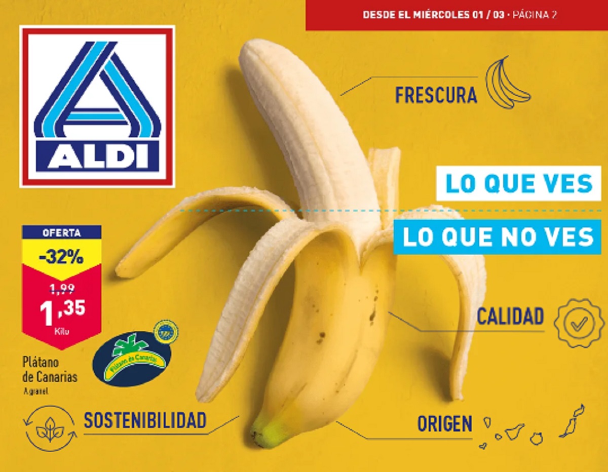 La fruta tiene o debería tener un lugar privilegiado en nuestra alimentación, por lo que Aldi ha decidido rebajarlo esta semana. Llega a la primavera con fuerza para que no te pillen los virus típicos de los cambios de tiempo. El plátano de Canarias ha bajado de 1,99 euros a 1,35 euros el kilo. Es una suma considerable si nos paramos a pensarlo. Nada más y nada menos que un 32%.