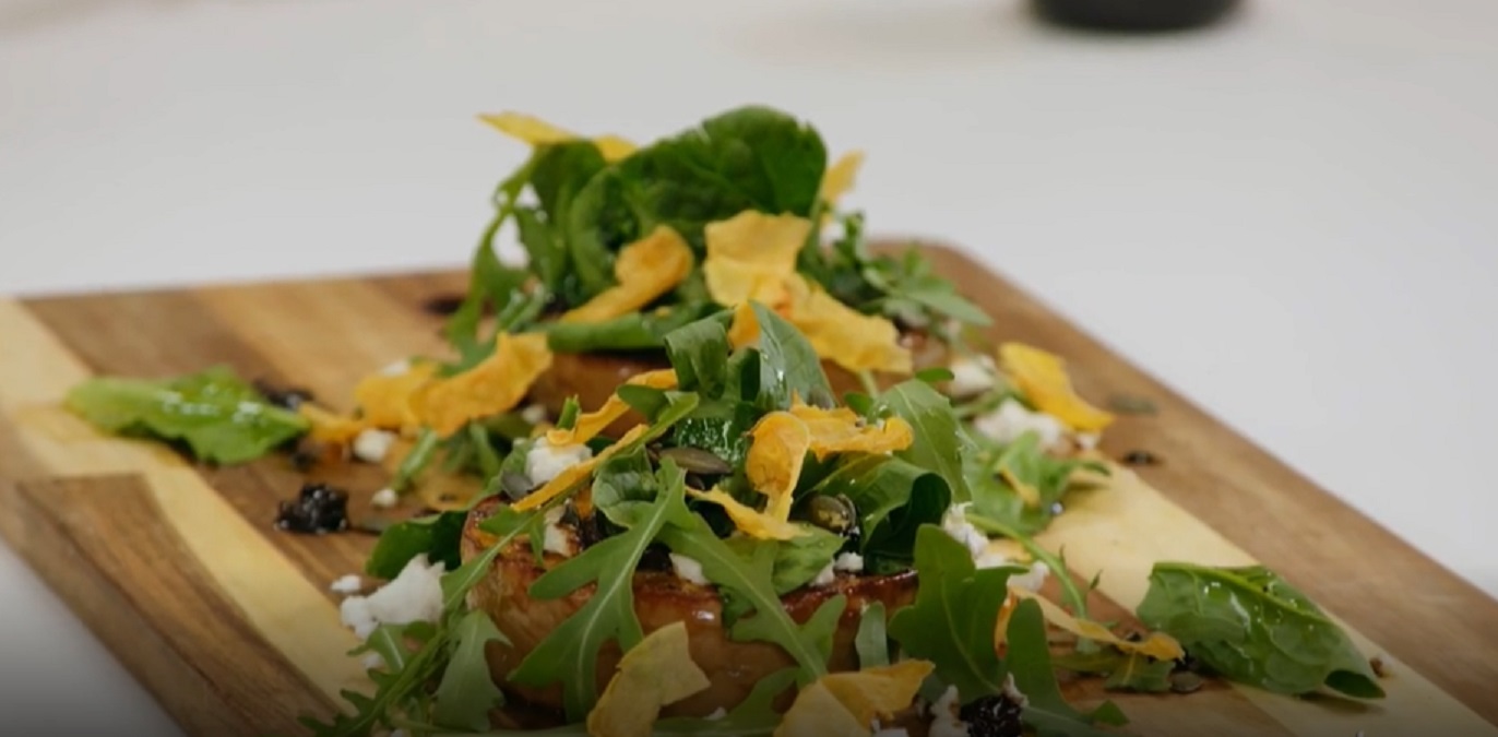 Ahora retiramos las rodajas de calabaza del horno y nos ponemos con el montaje. Ponemos rodajas de calabaza asado. Encima, agregamos queso feta desgranado. Regamos con vinagreta con pasas. El toque final se lo darán hojas de rúcula y espinacas. Aderezamos con vinagreta una vez más y la decoración culminará con pipas de calabaza y las chips. Recuerda que la diferencia entre un plato normal y uno que pasa al próximo nivel radica en su presentación.