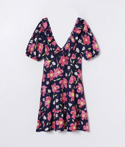 Los volantes llevan varias temporadas decorando nuestras prendas más alegres, y por supuesto van a seguir presentes en los vestidos más primaverales. En este caso los vemos en este precioso vestido corto con manta corta de estilo abullonado y un amplio escote en forma de pico, tanto el parte de delante como por la espalda. Lleva detalles de volantes decorativos en el escote y en el bajo y un lazo decorativo en la parte frontal. Está disponible en tres coloridos estampados, uno en verde, otro en color mandarina y otro con flores rosadas sobre un fondo azul marino. El precio en Lefties es de 12,99 euros.