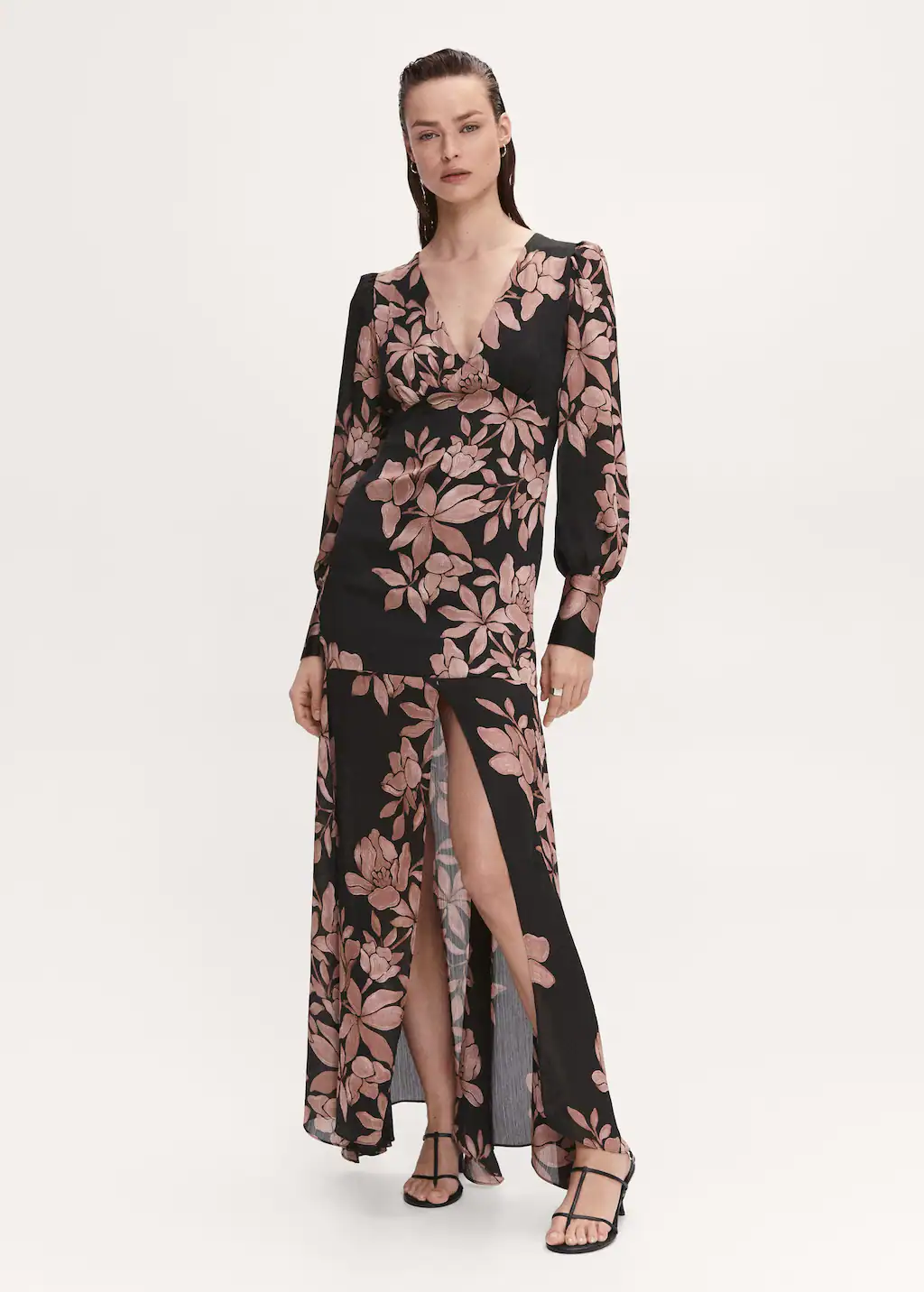 Si lo tuyo son las flores, este vestido se convertirá en la estrella de tu armario esta primavera. Se trata de un diseño largo y recto de manga larga con elegantes puños abotonado. El cuello tiene forma de pico y tiene una costura bajo la cadera, donde el vestido se abre con una larga abertura lateral. Cierra con una cremallera en la espalda y está hecho en poliéster muy vaporoso y fluido. Lleva forro interior para mayor comodidad, y tiene un estampado de flores rosadas sobre fondo negro. Lo puedes conseguir en Mango por un precio de 89,99 euros.
