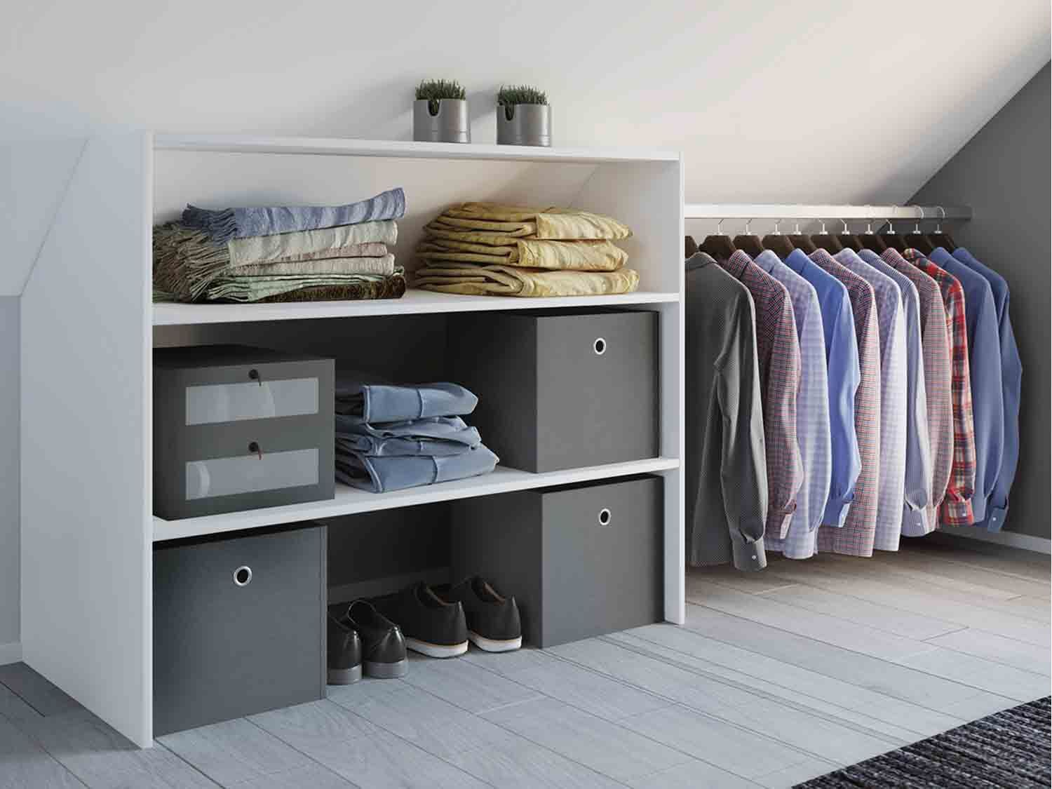 Este estante de techo está ligeramente inclinado en la parte de arriba, por lo que es una solución perfecta para buhardillas y estancias con techos inclinados, ya que permite aprovechar al máximo el espacio. El estante cuenta con un riel ajustable par usar como perchero. Se puede extender entre 70 y 110 cm y al no tener puertas permite tener todas las prendas bien localizadas y a la vista. El estante ofrece 3 compartimentos para guardar pendas dobladas, cajas de almacenaje, calzado, etc. Cada compartimento tiene 32 cm de altura y las medidas generales son de 90 x 100 x 50 cm. Se puede elegir entre color roble o blanco, y el coste es de 69,99 euros.