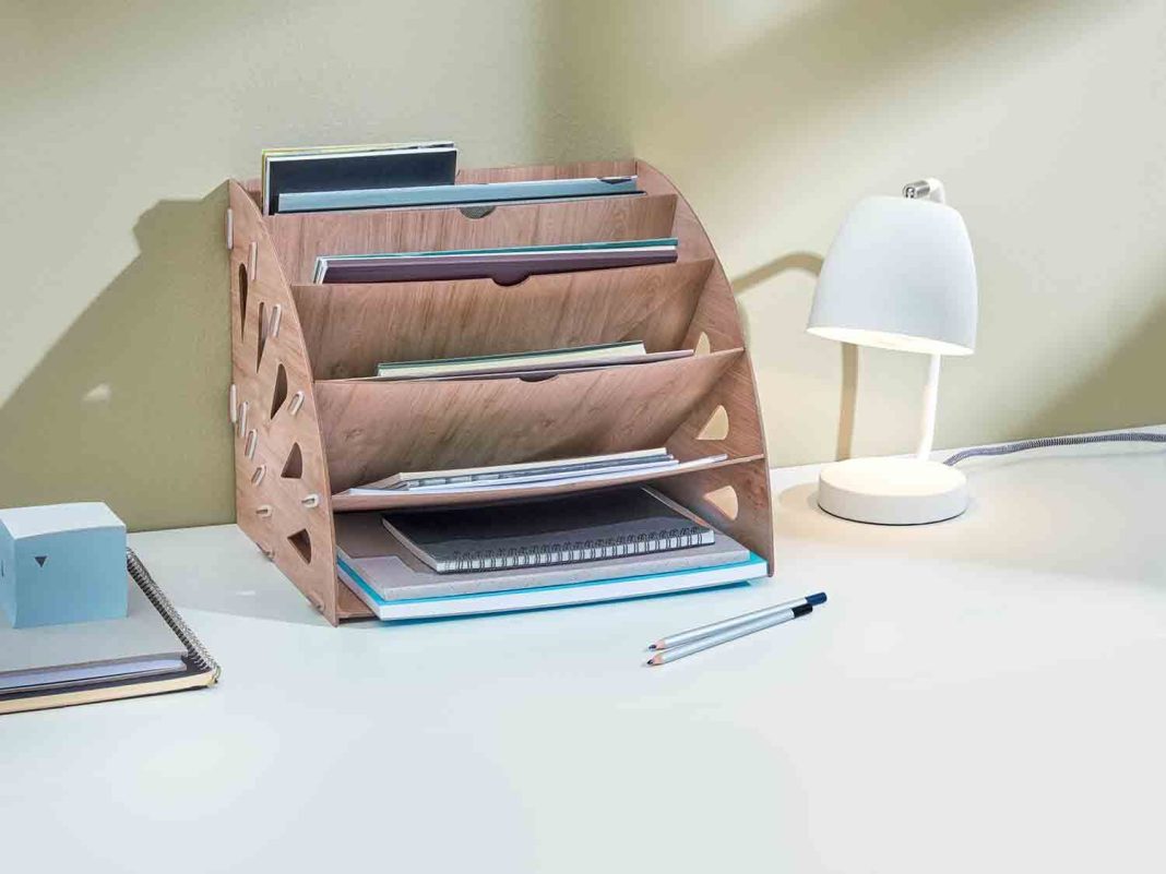 Este pequeño estante es un accesorio tan práctico como original para la oficina o la zona de estudio. Tiene una llamativa forma de acordeón con 5 compartimentos para guardar documentos, libretas, carpetas, etc. Tiene unas medidas de 34 x 28 x 28 cm. y es de cartón reciclado muy resiente con un bonito acabado de madera. Ofrece múltiples posibilidades, ya que se puede utilizar para ordenar cualquier tipo de objetos. El precio en Lidl es de 9,99 euros.