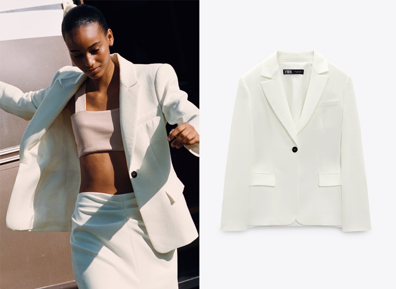Entre los modelos más interesantes que están actualmente a la venta en Zara se encuentra esta blazer en tallada en color crudo que se encuentra confeccionada en poliéster, con forro 100% acetato. Se vende en tallas XS a XL.