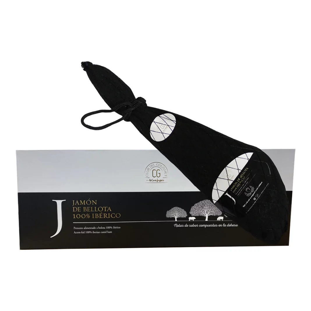 Empezamos muy fuerte con este estuche que viene con un jamón de bellota 100% ibérico. Este jamón está elaborado con el mejor trato, con una hectárea para cada animal, con abundante pastoreo, alimentación a base de bellotas y un clima que lo hace ideal para la crianza del mismo en el mejor estado.