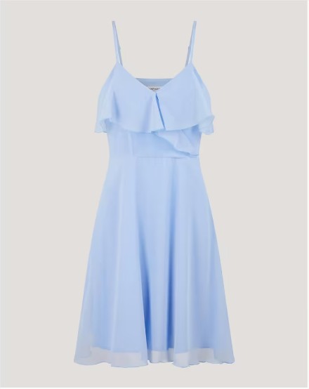 Hablamos de un vestido liso corto de tirantes y cuello pico. Tiene volante en la parte de arriba y falda evasé con forro. Si te interesa esta prenda perfecta para primavera, aquí la encontrarás.