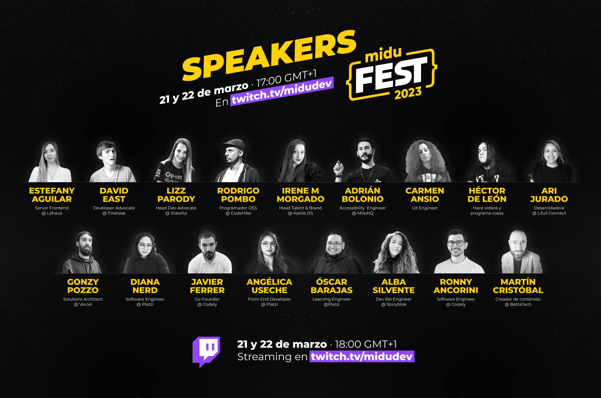 Este 21 y 22 de marzo a las 6PM (hora de España), se llevará a cabo miduFest, una conferencia de programación y desarrollo en línea que reunirá a más de 20 expertos internacionales del mundo de la programación. La conferencia será gratuita y se retransmitirá en vivo a través de la plataforma Twitch en el canal de midudev: https://twitch.tv/midudev.
