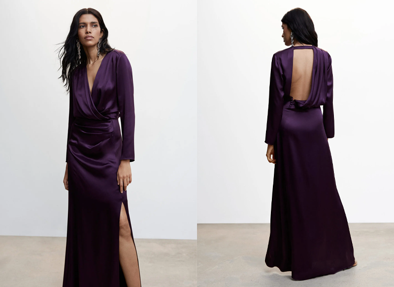 Una última recomendación de la firma española para una boda o cualquier otro evento importante es este vestido satinado cruzado de color morado, una prenda muy elegante que se vende en tallas XS a XL por un precio de 79,99 euros.