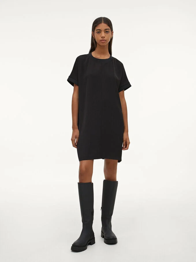 Este vestido básico de Parfois tiene un diseño sencillo y muy favorecedor que permite múltiples posibilidades. Es de color negro liso, fabricado en 100% poliéster con cuello redondo y manga corta, con un estilo similar a una camiseta larga. Tiene dos bolsillos laterales y un dobladillo en las mangas. El corte es recto y holgado. Juega con los complementos para darle un carácter diferente y adaptarlo a distintos looks. Es talla única, ya que se adapta a tallas S hasta la L. Tiene un precio de 25,99 euros.