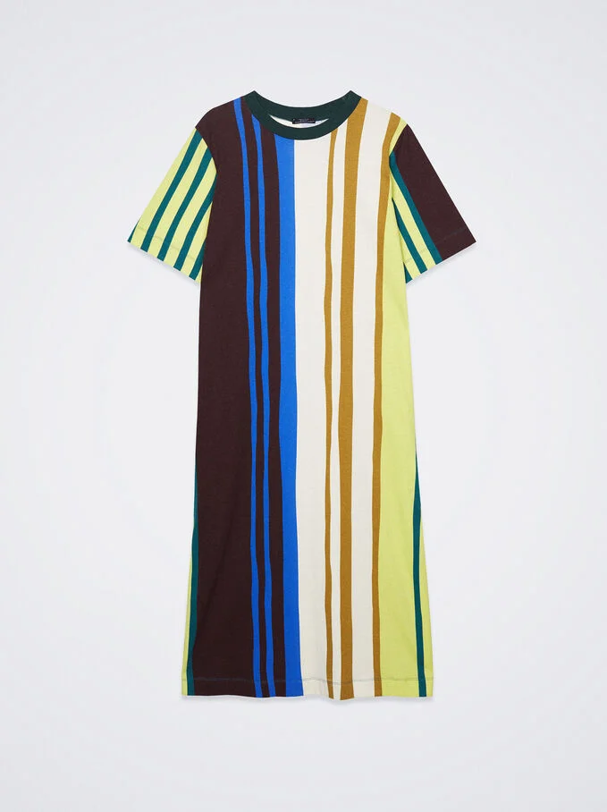Otro de los vestidos más llamativos de Parfois es este modelo de rayas multicolor, que atrapará la atención de todo el mundo. El corte de la prenda es muy sencillo, recto, holgado y muy cómodo, hecho en tejido 100% algodón. Es de manga corta con cuello redondo con rib en color a contraste. El vestido tiene una abertura lateral para mayor comodidad. Lo puedes conseguir por 25,99 euros.