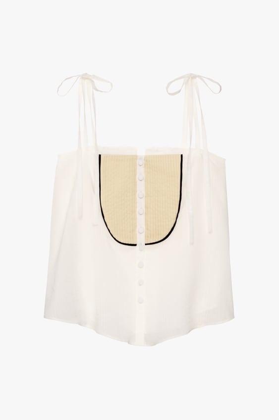 Este top está inspirado en los antiguos corpiños que llevaban las mujeres debajo del corsé. Tiene un escote recto y tirantes finos que se pueden ajustar con un lazo. Lleva un detalle de tejido plisado en la pechera con colores contraste. Cierra en la parte frontal con delicados botones forrado y lleva un acabado deshilachado que le da un toque de actualidad. Es de un suave color crema y está confeccionado con una mezcla de viscosa, poliamida y algodón. Su precio es de 49,95 euros.